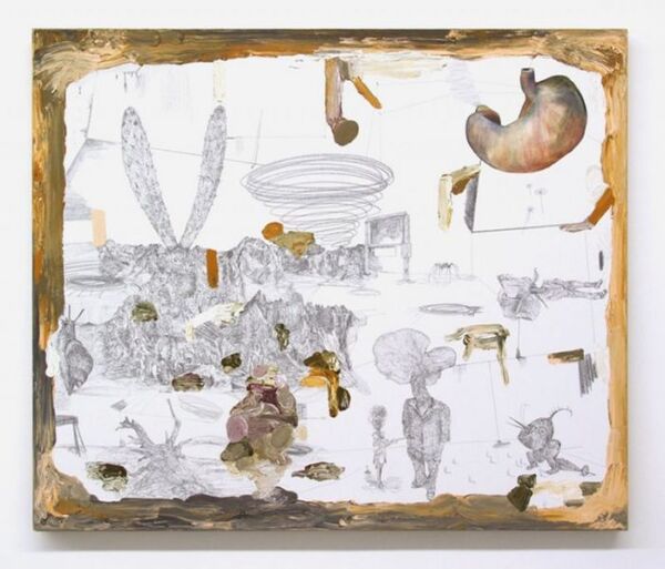 from the series 'Migrated Landscape / Quand le chat est parti, les souris dansent', graphite, oil and collage on canvas, 120 x 180 cm, 2009