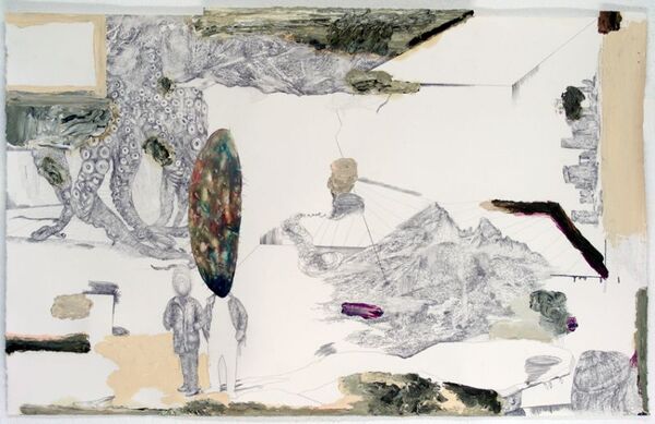 from the series' Migrated Landscape / Quand le chat est parti, les souris dansent', graphite, oil coulour and collage on canvas, 120 x 180 cm, 2009