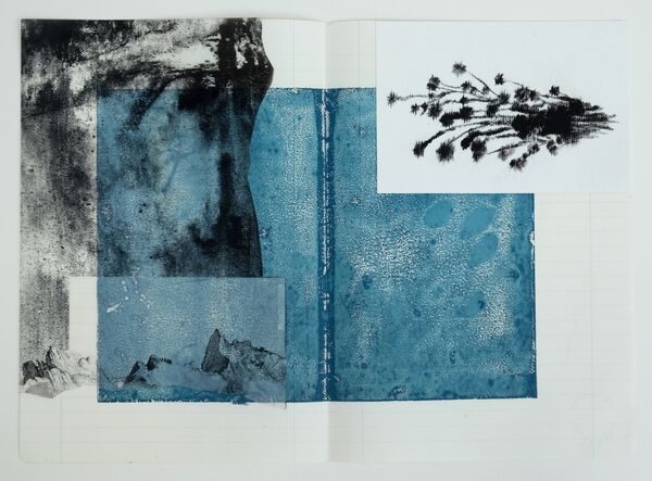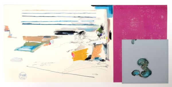 'Deriva y dispersión', graphite, water colour and China ink on paper, oil, graphite and acrylic paint on canvas, xylography on paper, 29 x 63 cm, 2018