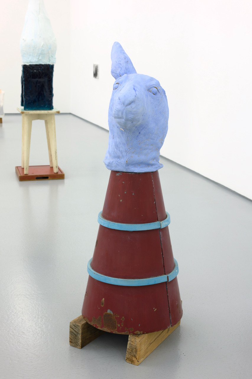'Kangaroo (Monument)', ceramic plaster with iron oxide, painted iron, wood, 101 x 35 x 37 cm, 2025. Partial exhibition view 'Natural History', Galeria Vera Cortês, Lisbon (PT), 2025/26