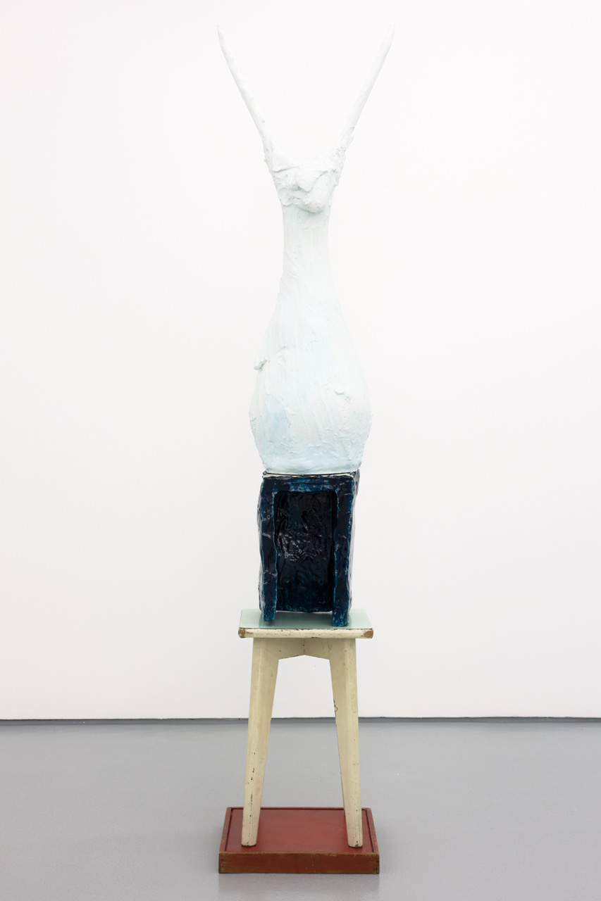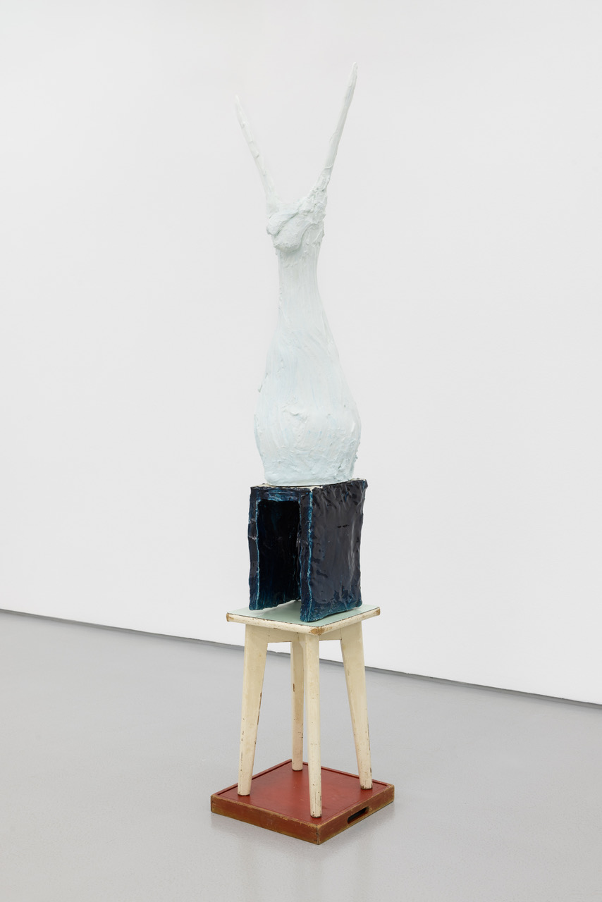 'Mollusk NR', ceramics, painted wood, ceramic plaster with iron oxide, iron structure, gauze and plastic, 188 x 35 x 35 cm, 2025