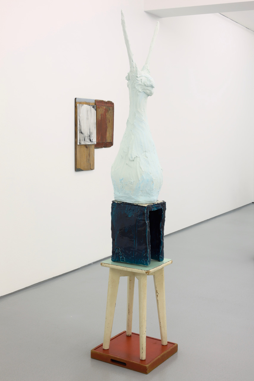 'Mollusk NR', ceramics, painted wood, ceramic plaster with iron oxide, iron structure, gauze and plastic, 188 x 35 x 35 cm, 2025. Partial exhibition view 'Natural History', Galeria Vera Cortês, Lisbon (PT), 2025/26