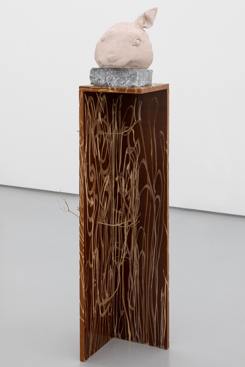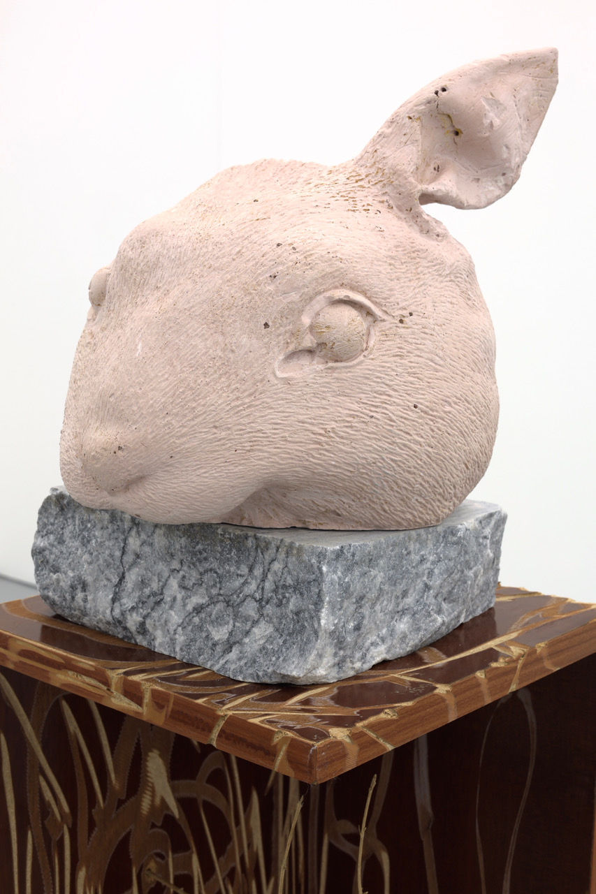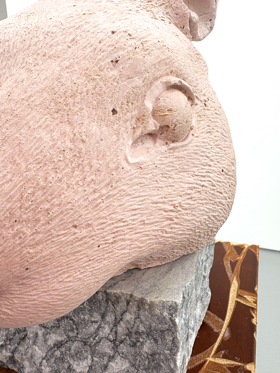 'One-Ear Rabbit (Monument)', detail: ceramic plaster with iron oxide, marble, veneered chipboard, 2025