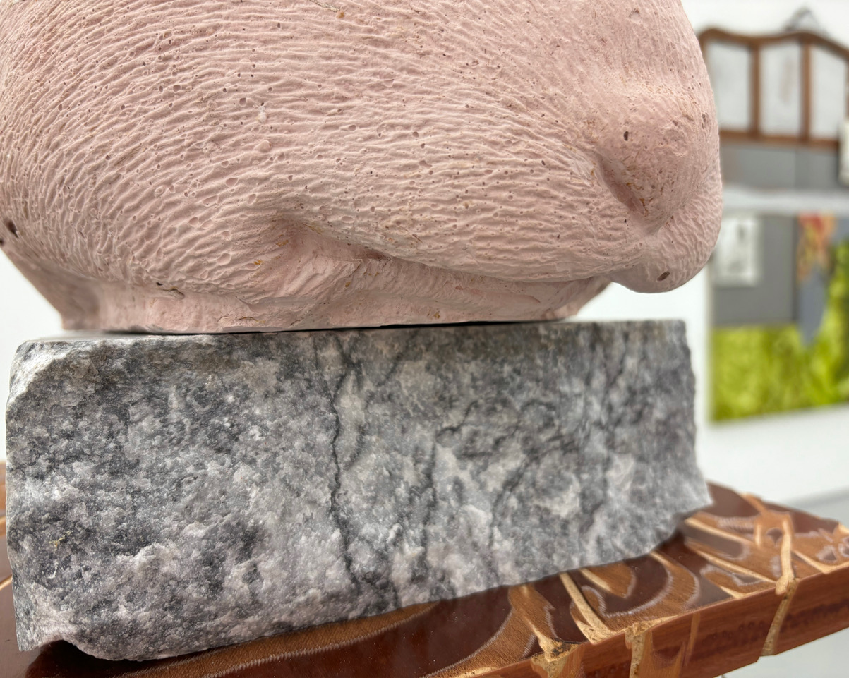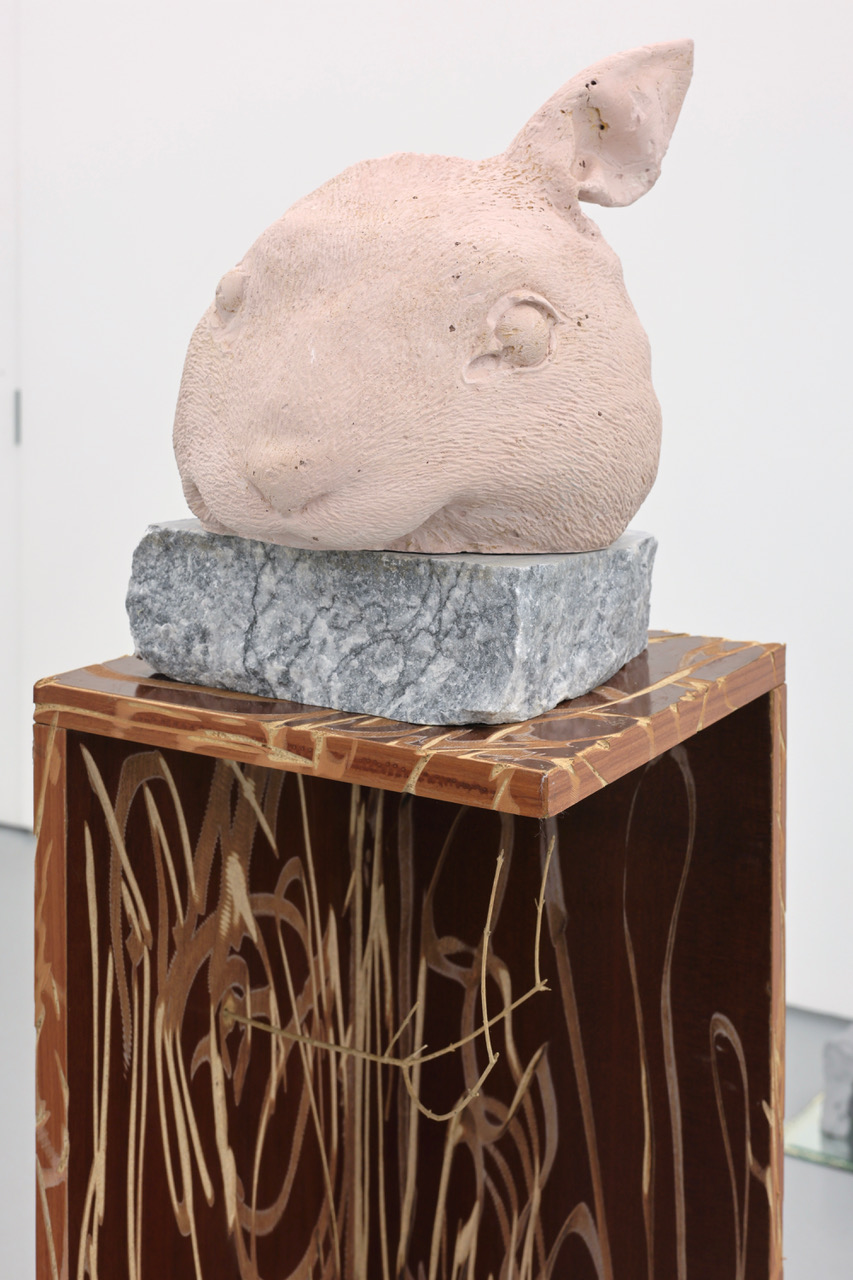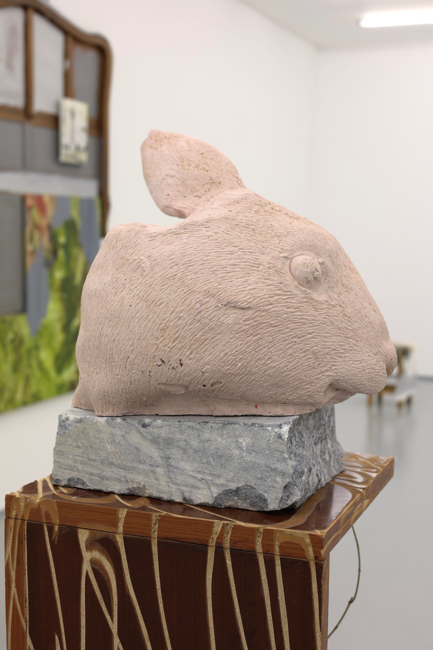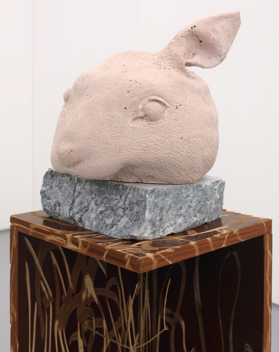 'One-Ear Rabbit (Monument)', detail: ceramic plaster with iron oxide, marble, veneered chipboard, 2025. Partial exhibition view Galeria Vera Cortês, Lisbon (PT), 2025/26