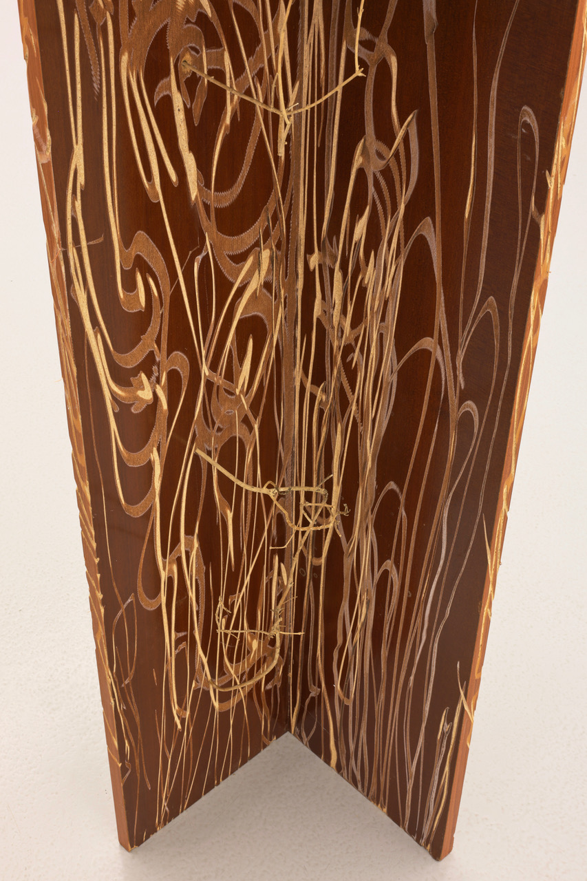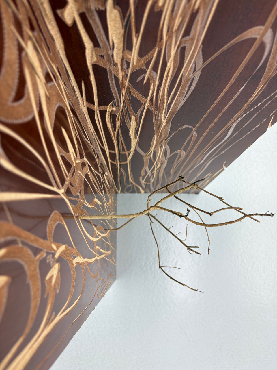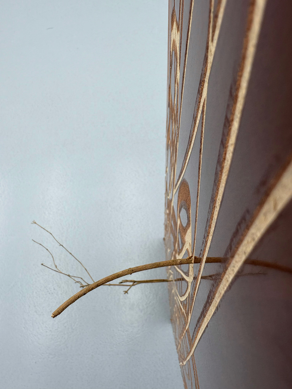 'One-Ear Rabbit (Monument)', detail: veneered chipboard, tree branches, 2025