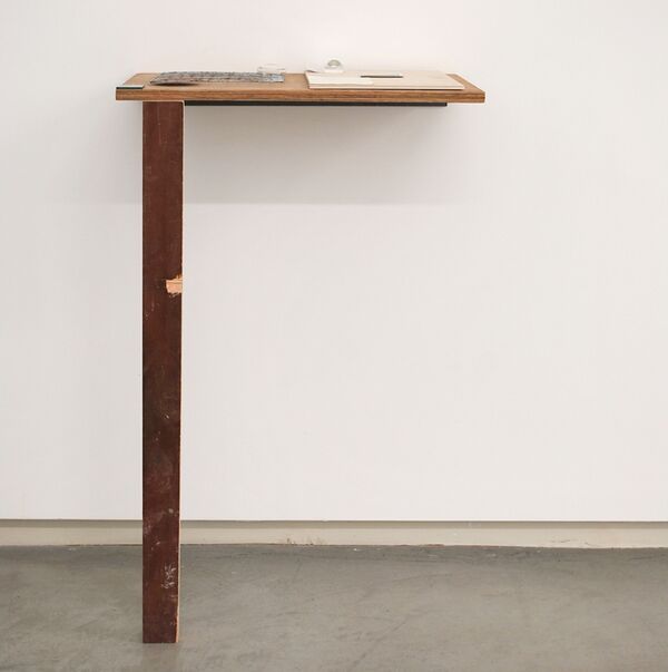 'Vertical Line. Squares. A Drawing.', wooden boards, grid, lined paper, oil on paper, stickers, loupe, flagstone, iron girder, 92 x 58,5 x 38,5 cm, 2015