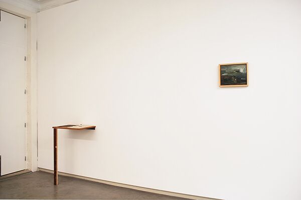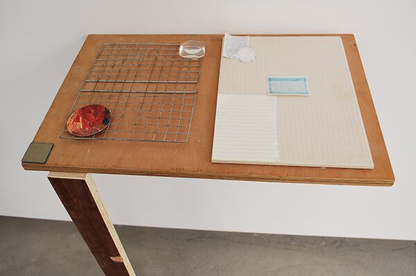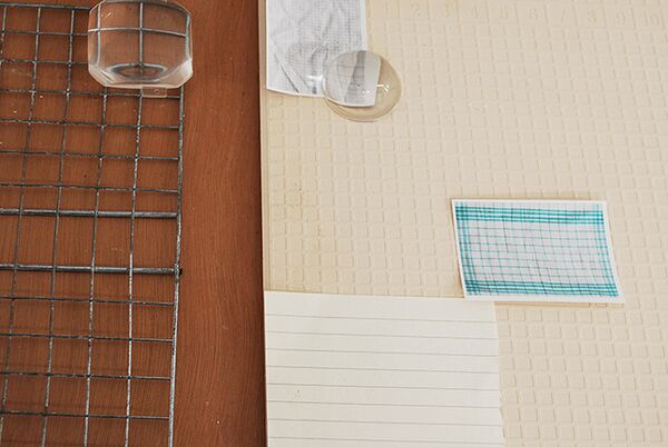 'Vertical Line. Squares. A Drawing.' (detail), wooden boards, grid, lined paper, oil on paper, stickers, loupe, flagstone, iron girder, 92 x 58,5 x 38,5 cm, 2015